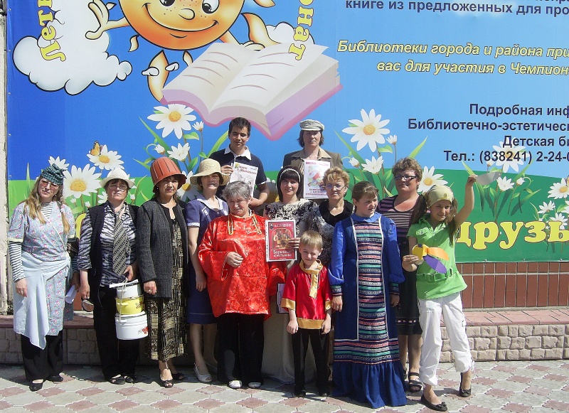 Сказочная героиня Баба Яга развлекала детей интересными играми и загадками. На праздник пришли герои книг-участниц Летнего читательского чемпионата-2012: девочка Женя из книги В.Катаева «Цветик-семицветик», мальчик-гимназист из повести Л.Кассиля «Кондуит и Швамбрания», Лиза из повести А.С. Пушкина «Барышня-крестьянка», сестрица Аленушка и братец Иванушка из русской народной сказки, домовенок Кузька из книги Т.Александровой, бабушка и Колобок из повести Э.Успенского «Колобок идет по следу», мисс Стонер из произведения К.Дойла «Пестрая лента», Вася Куролесов из книги Ю.Коваля. В заключение праздничной программы сотрудники библиотеки раздали детям закладки-памятки с условиями участия в Чемпионате.