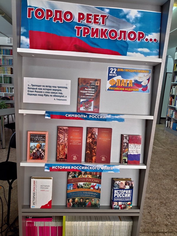 Выставка "Гордо реет триколор" оформлена ко Дню Государственного флага Российской Федерации. Как известно, это важнейший атрибут, отражающий особенности исторического развития общества, обычаи и традиции. Из книг, представленных на выставке, читатели узнают о появлении, оформлении и значении флага, о цветах флага России, сыгравших большую роль в становлении русского национального культурного сознания.