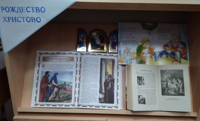 В библиотеке-филиале №5 села Филимоновка для детей оформлена православная полка "Рождество Христово". На ней размещены икона-складень "Рождество Христово" и книги, в которых рассказывается о рождении Иисуса Христа и празднике Рождества.