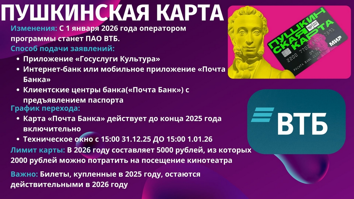«Пушкинская карта» — государственная программа поддержки культуры для молодёжи в возрасте от 14 до 22 лет. С её помощью можно покупать билеты на культурные мероприятия: театры, музеи, выставки, концерты, кино и другие события.