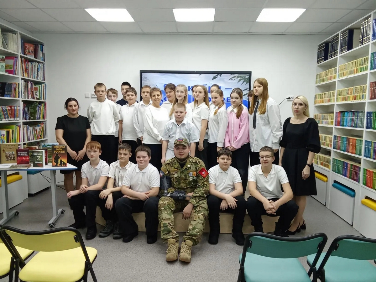 Патриотический час стал мостом между прошлым и настоящим. Вспоминали о героизме солдат Великой Отечественной, о мужестве воинов-интернационалистов, прошедших сквозь огонь Афганистана, Чечни, и, конечно, о современных защитниках Родины, чьи имена сейчас вписаны в героическую летопись специальной военной операции. Особым гостем стал Антон Сергеевич Кайдаров, участник СВО. Его слова, пропитанные правдой окопов, о значимости служения Отечеству и о важности несгибаемой воли, нашли живой отклик в сердцах юных слушателей.