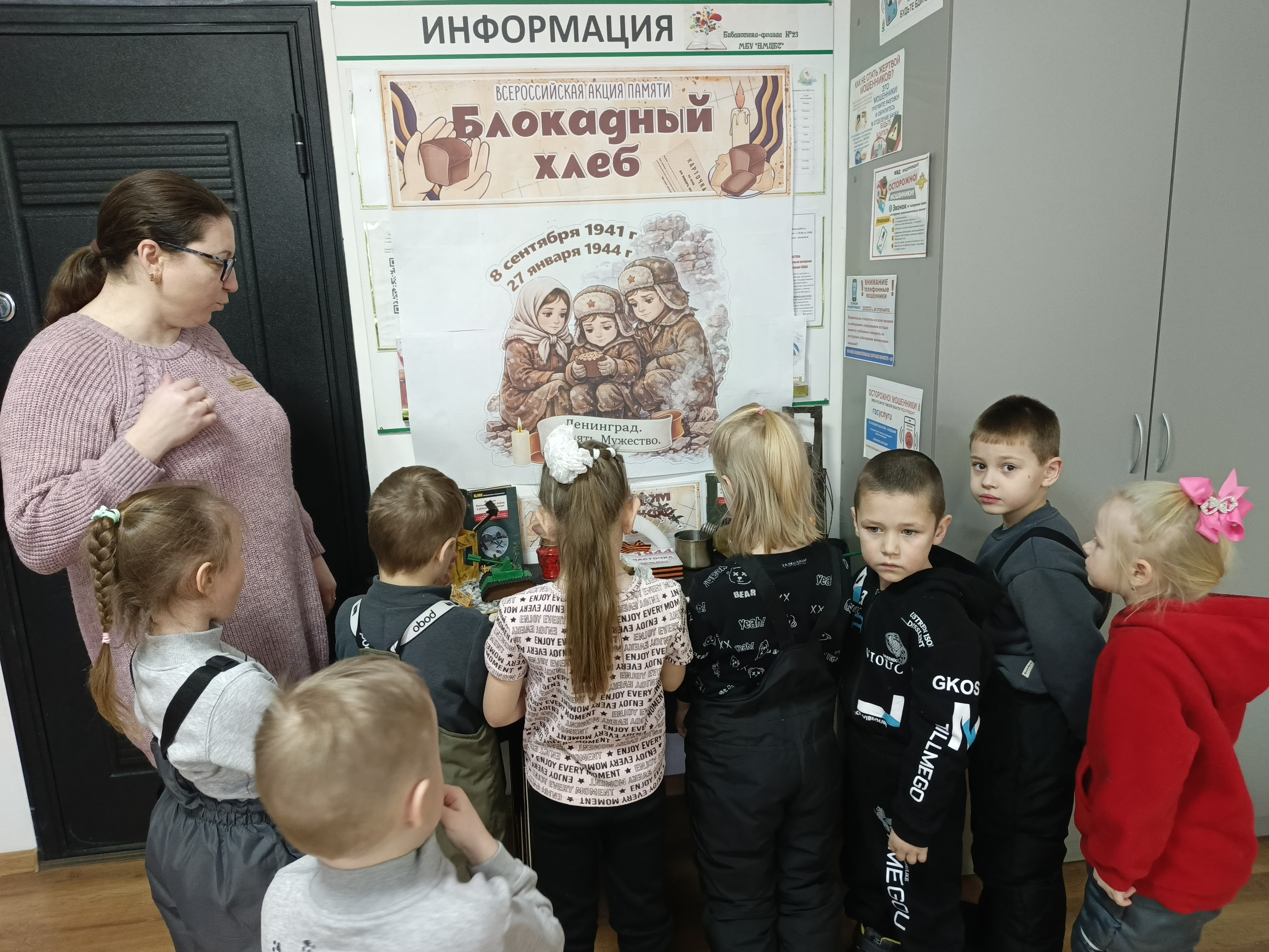 В библиотеке-филиале № 23 (ул. Мирная 39/3) организована книжная выставка "82 года со дня полного снятия блокады Ленинграда". Также вниманию читателей представлена экспозиция "Свет сквозь тьму": Блокадный хлеб, поэзия и вечная память. Для ребят из детского сада "Рыбка" сотрудники библиотеки провели Всероссийскую акцию памяти "Блокадный хлеб", в ходе которой дети познакомились с книжной выставкой, посвящённой полному снятию блокады Ленинграда, и с произведениями известных авторов, писавших о героической обороне города. Особое внимание ребят привлекла экспозиция "Свет сквозь тьму: Блокадный хлеб, поэзия и вечная память". В заключение мероприятия библиотекари организовали для дошкольников мастер-класс "Блокадная ласточка".