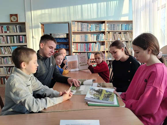 Затем библиотекарь провела обзор тематической папки, в ходе которого дети узнали о растительности и деревьях, находящихся на территории болота.