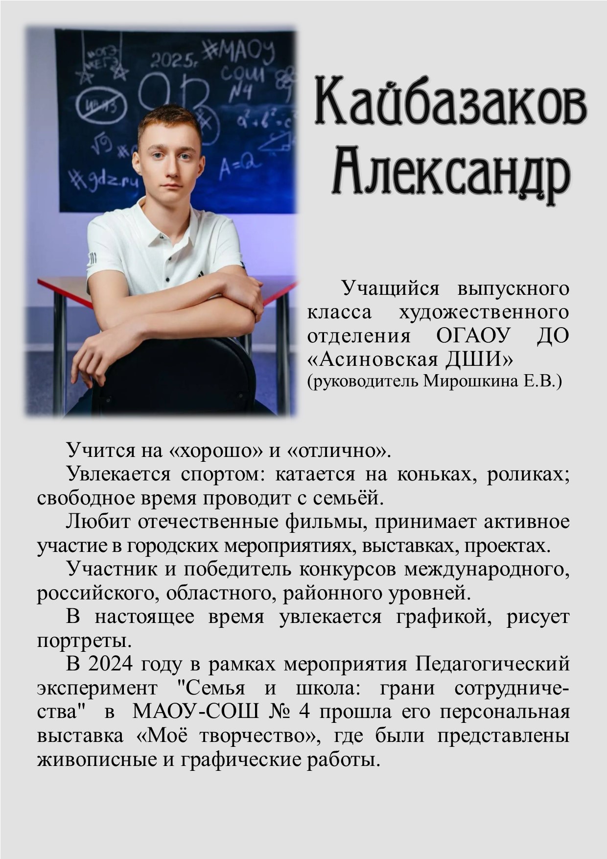 Сектор Графики БЭЦ открывает двери для всех желающих познакомиться с творческими работами Александра Кайбазакова, ученика выпускного класса художественного отделения ОГАОУ ДО "Асиновская ДШИ" (руководитель Мирошкина Е.В.).