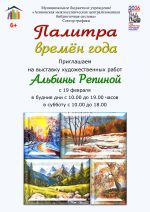 С 19 февраля сотрудники сектора Графики и художница Альбина Репина приглашают на художественную выставку "Палитра времён года". В каждой картине, в каждом времени года не только изображение природы, но и настроение, которое передаёт автор зрителю: обновление весны, энергию лета, созерцательность осени и спокойствие зимы. В рамках одной выставки можно пережить всю палитру эмоций сразу.