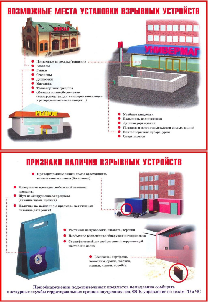 Помните: внешний вид предмета может скрывать его настоящее назначение. В качестве камуфляжа для взрывных устройств используются самые обычные бытовые предметы: сумки, пакеты, коробки, игрушки и т.п.