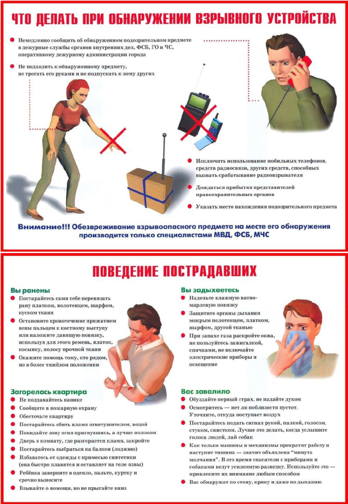 Оказавшись вблизи или в месте проведения террористического акта, следует как можно скорее покинуть его без паники, избегать проявлений любопытства, при выходе из эпицентра постараться помочь пострадавшим покинуть опасную зону, не подбирать предметы и вещи, не проводить видео и фотосъемку.