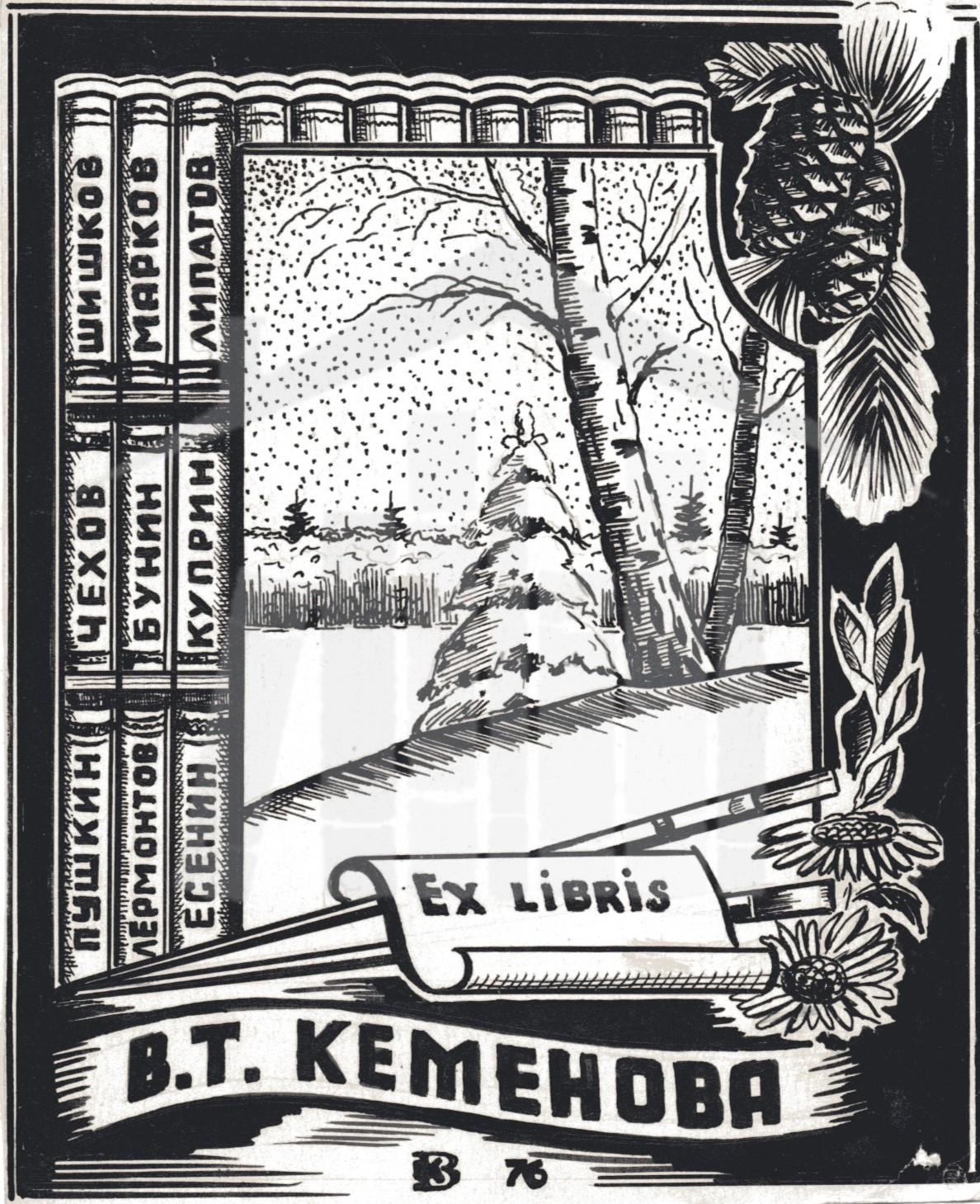 EX LIBRIS В.Т. Кеменова Зимний пейзаж на палитре, книги техника Р1 размер изображения 69х55 мм год создания 1976 г