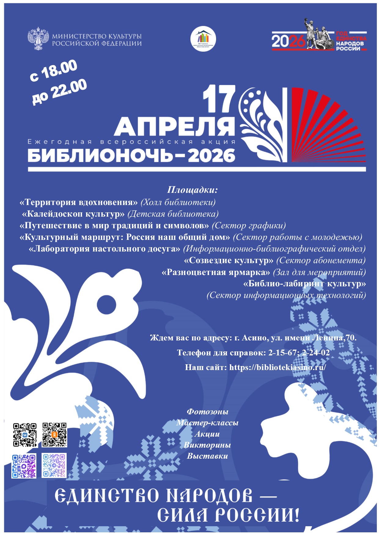 Присоединяйтесь к ежегодной всероссийской акции "Библионочь-2026", которая состоится 17 апреля с 18:00 до 22:00. Это уникальное событие объединяет людей разных возрастов и интересов, предлагая насыщенную программу мероприятий, посвященных единству народов России.