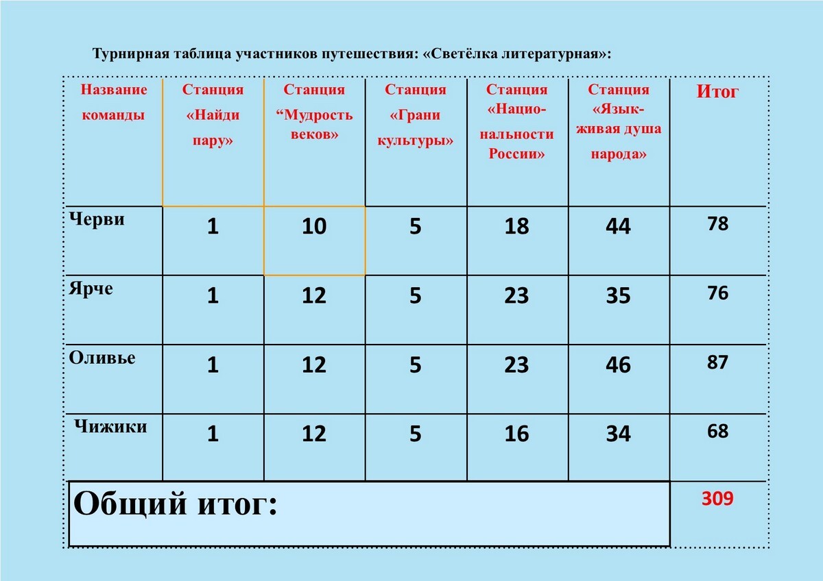 Турнирная таблица участников литературного путешествия Светёлка литературная шк. № 4